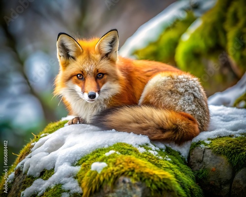Fototapeta premium A beautiful red fox rests on a mossy rock covered in snow