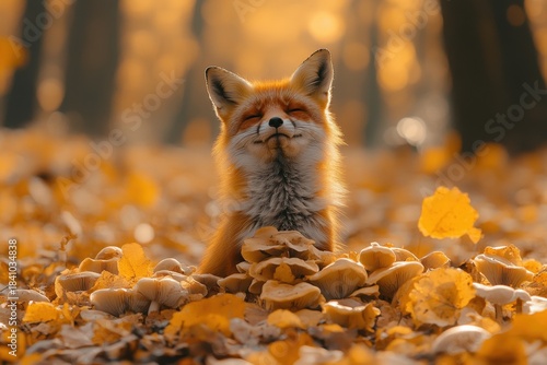 © Miramiska, Obraz premium A beautiful red fox rests peacefully amongst fallen autumn leaves, eyes closed in a moment of tranquility and relaxation. Warm colors and a serene mood.