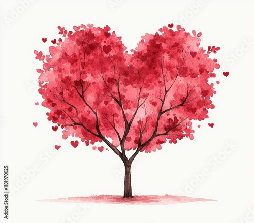 © Emmy Ljs, Fototapeta premium A beautiful red heart-shaped tree with branches filled with blossoms and leaves representing love and nature in different seasons.