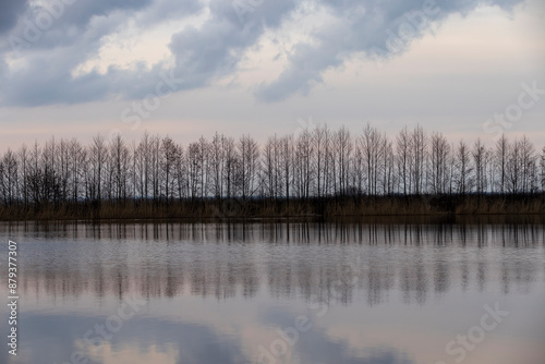 © rsooll, Fototapeta premium a beautiful reflection of the sky and clouds in the lake at sunset