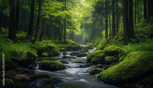 Fototapeta premium A beautiful river meanders through a lush and vibrant green forest