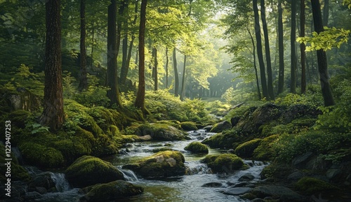 Fototapeta premium A beautiful river meanders through a lush and vibrant green forest