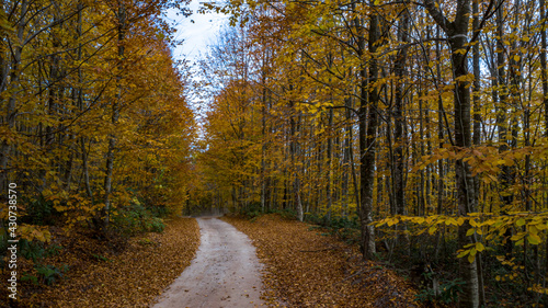 Obraz premium A beautiful road view through the forest in autumn.
