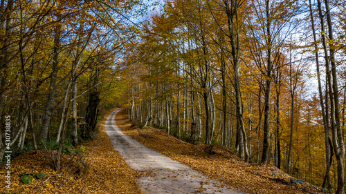 Fototapeta premium A beautiful road view through the forest in autumn.