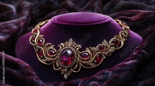 © ArtifyNow, Obraz premium A beautiful ruby necklace with intricate gold details, laid out on a rich purple velvet cloth for a luxurious look.