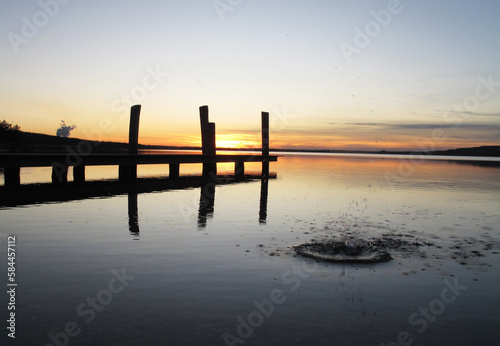 © Sinuswelle, Naklejka premium A beautiful scene with deep sun and a stone splash in the water at a lake