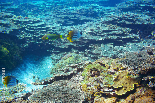 Fototapeta premium 素晴らしいサンゴ礁の美しいトゲチョウチョウウオ(チョウチョウウオ科)、ヤマブキベラ(ベラ科)他の群れ。スキンダイビングポイントの底土海水浴場。...