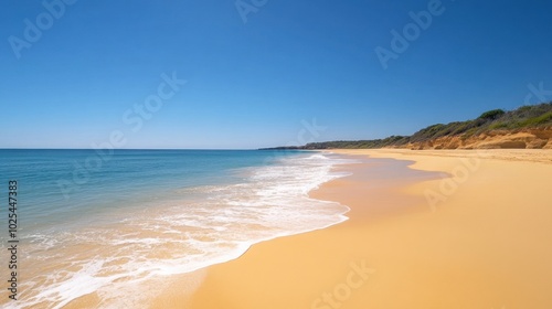 © logyartstudios, Obraz premium A beautiful, serene beach with clear blue water, white sand, and a bright blue sky.
