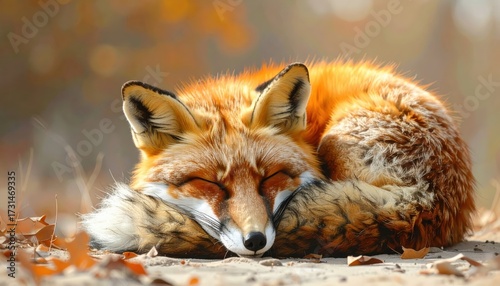 Obraz premium A beautiful, serene image showcases a sleeping fox curled up comfortably amongst fallen autumn leaves, its orange and white fur vividly contrasting with the blurred, natural background, creating a...
