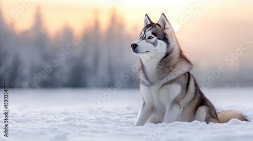 Naklejka premium A beautiful Siberian husky rests on fresh snow, surrounded by a serene winter landscape. The early morning sun casts a warm glow, highlighting the dog's striking features.