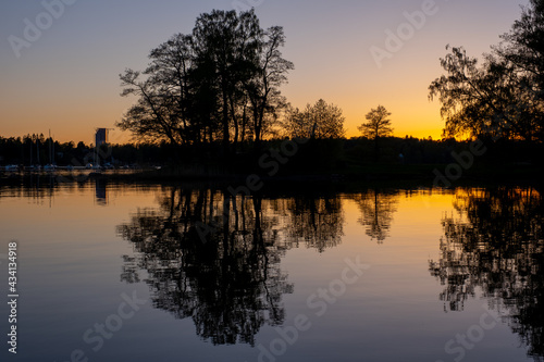 © Marko Hannula, Fototapeta premium A beautiful silhouette of a large tree on an island casting reflection on the water during sunset.