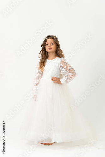 Fototapeta premium A beautiful six-year-old girl is posing, looking at the camera. Studio portrait. White background