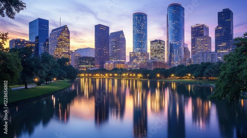 © pingpao, Naklejka premium A beautiful skyline of modern skyscrapers reflected in a calm lake at sunset, showcasing vibrant colors and urban tranquility.