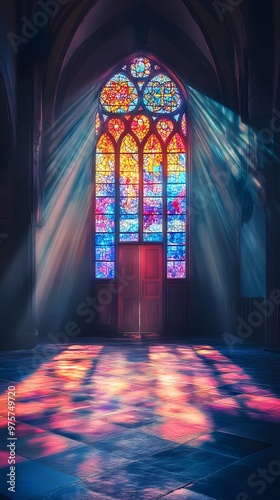 © Jakub, Obraz premium A beautiful stained-glass window in the middle of an empty church, with rays of light streaming through it