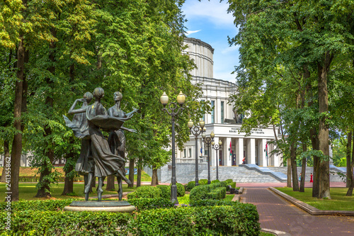 Naklejka premium A beautiful statue in the middle of a garden in front of a huge building in Minks, Belarus