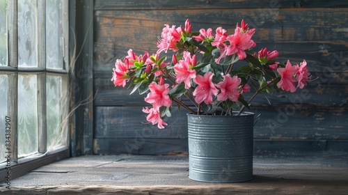 © NongKirana, Fototapeta premium A beautiful still life of a potted azalea plant with delicate pink flowers, placed in front of an old wooden window