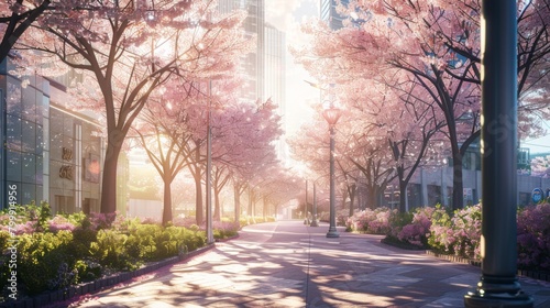 Obraz premium A beautiful street with cherry blossom trees in full bloom