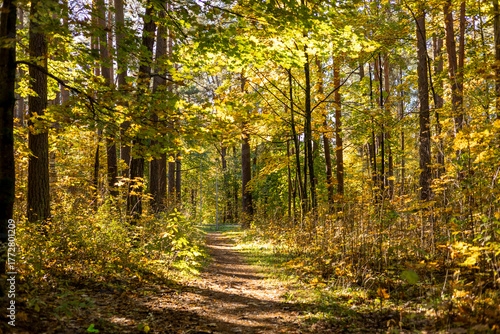 Fototapeta premium A beautiful sunny autumn day in the woodlands of Latvia. Fall scenery with...