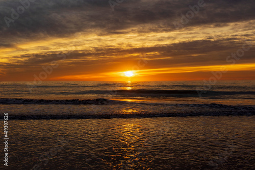 © vicenfoto, Obraz premium A beautiful sunrise from the shore of the beach
