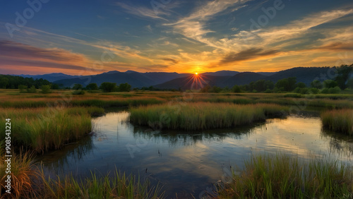 © AungThurein, Fototapeta premium A beautiful sunrise landscape with a tranquil lake