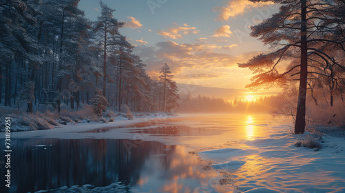 © visoot, Fototapeta premium A beautiful sunrise over a frozen lake after a bleak midwinter. pine trees. Generative AI.