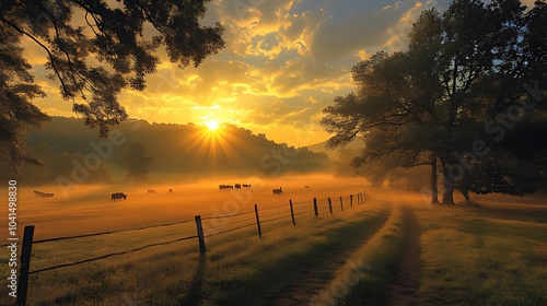 © pete99, Obraz premium A beautiful sunrise over a grassy field with cattle grazing in the distance. The sun shines through the morning mist, creating a warm glow over the landscape.