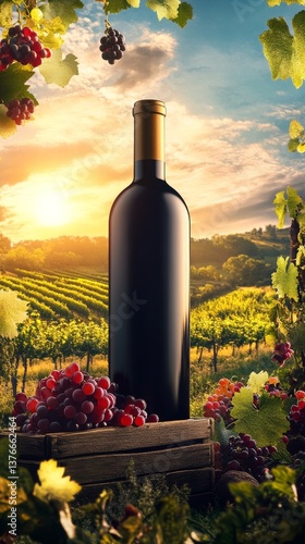Fototapeta premium A beautiful sunset glows over a picturesque vineyard, featuring a wine bottle surrounded by fresh grapes