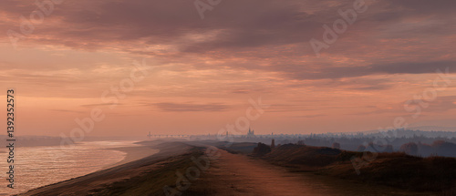 © Toey Meaong, Fototapeta premium A beautiful sunset over a beach with a city in the distance