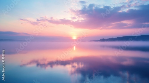 © ZeeZaa, Fototapeta premium A beautiful sunset over a calm lake with a reflection of the sun in the water