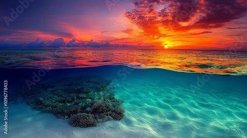 © Ilona, Fototapeta premium A beautiful sunset over the ocean with a coral reef in the foreground