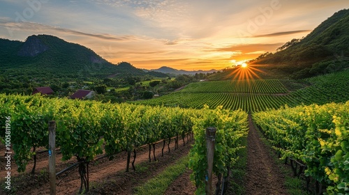 © Puttipong, Naklejka premium A beautiful sunset view at the vineyards in Wang Nam Khiao, with grapevines glowing in the evening light.
