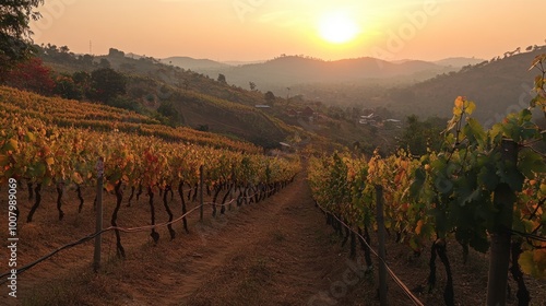 © Puttipong, Fototapeta premium A beautiful sunset view at the vineyards in Wang Nam Khiao, with grapevines glowing in the evening light.