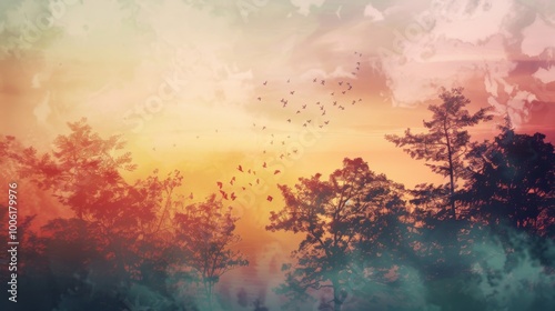 © Cloudyew, Fototapeta premium A beautiful sunset with a flock of birds flying in the sky