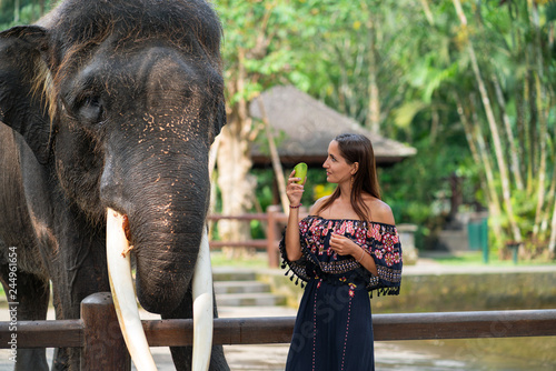 Fototapeta premium a beautiful, tanned girl in a dress gives an elephant a treat in the form of...