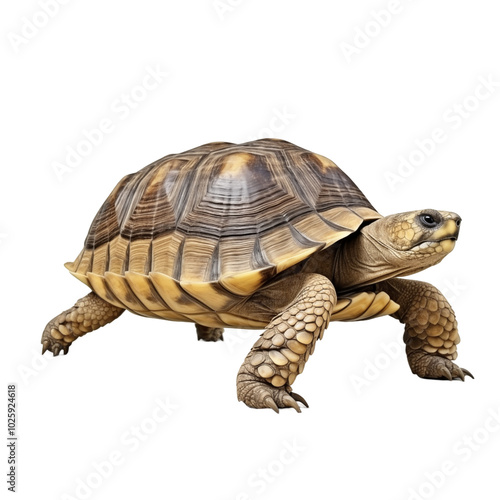 © Minimal Blue, Fototapeta premium A beautiful tortoise walking slowly on a white surface under soft lighting