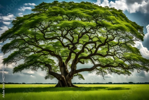 Fototapeta premium A beautiful tree stands tall and proud in the middle of a vast field covered with lush green grass generative ai technology