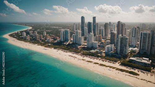 Naklejka premium A beautiful tropical beach in the Maldives with umbrellas, palm trees, and...