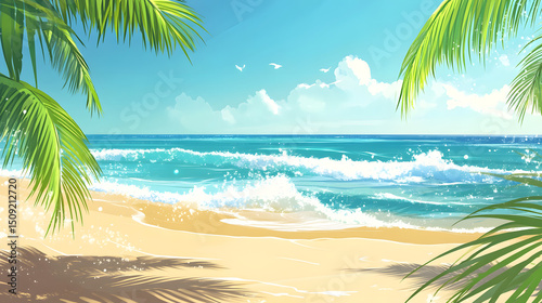 Fototapeta premium A beautiful tropical beach with golden sand, palm trees and crashing waves on a sunny summer day. The perfect backdrop for a relaxing vacation.