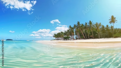 © hooyah808, Naklejka premium A beautiful tropical beach with palm trees and a clear blue sky, adds to its picturesque charm. This tranquil coastal setting evokes images of summer