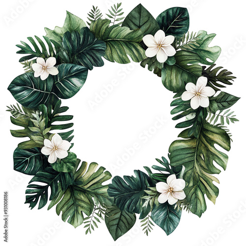 Naklejka premium A beautiful tropical wreath featuring lush green leaves and white flowers, perfect for home decor or event decoration.