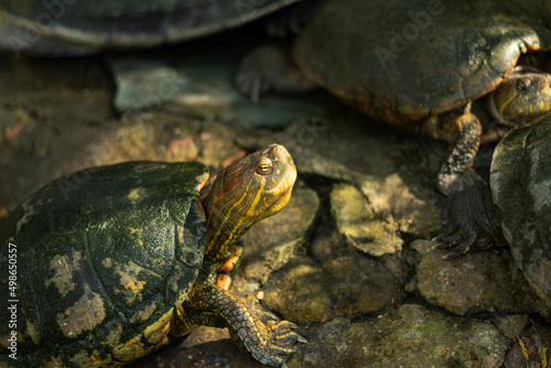 © Andres Serna, Fototapeta premium A beautiful turtle on a rock receiving a sunbeam on its head