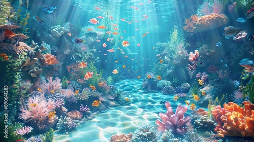 Naklejka premium A beautiful underwater scene showcasing a vibrant coral reef teeming with colorful fish and illuminated by bright sunlight streaming through the water.