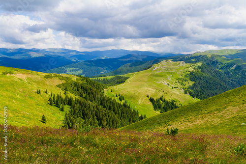 Fototapeta premium A beautiful valley in the Fagaras Mountains near Lake Vidraru. Grassy slopes covered with grass and coniferous forest. Southern Carpathians, Romania