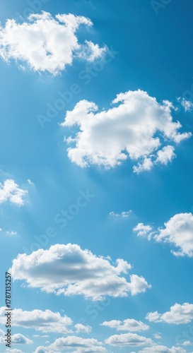 Naklejka premium A beautiful, vast expanse of bright blue sky filled with scattered white, fluffy clouds on a sunny, perfect day ,stratus ,cloud ,serenity