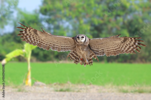 © Passakorn, Fototapeta premium A beautiful Verreaux's eagle-owl is flying back to its owner.