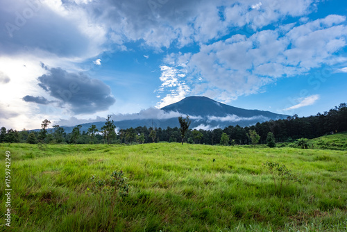 © Erhan, Naklejka premium A beautiful view of a lush green meadow with a dense forest at the base of a majestic mountain