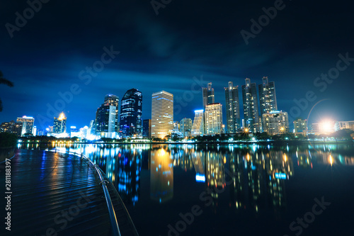 © feeling lucky, Fototapeta premium a beautiful view of Benjakitti Park in Bangkok, Thailand at night with water reflection