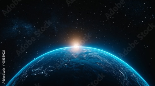 © adri, Obraz premium A beautiful view of Earth from space with stars and a sunrise.