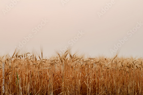© thatinchan, Obraz premium A beautiful view of the beautiful barley field in the morning is a rare view in the summer, and the golden barley field is a barley field cultivated for making alcoholic beverages.