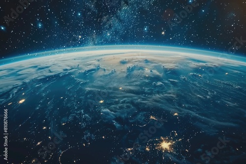 Fototapeta premium A beautiful view of the Earth from space, with the planet's surface illuminated by the stars. The night sky is filled with a multitude of stars, creating a serene and peaceful atmosphere